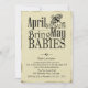 Chás de abril trazem muitos bebês. Personalize os detalhes para o seu chá de fraldas de abril neste convite à apresentação de chás de fraldas à moda antiga e rústica.