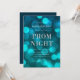 Convite de baile elegante com as palavras "Noite de Baile" em folha de prata falsa contra um fundo de luzes bokeh azul aqua. O convite tem um verso com fundo azul escuro.