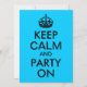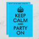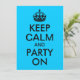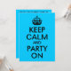 Áreas de texto personalizáveis em uma paródia azul aqua e preta "Manter Calmo e Festa Ligada" para uma festa de aniversário.