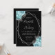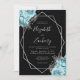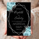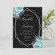 This elegant modern wedding invitation features a silver geometric frame decorated with aqua and silver floral bouquets on a black background. The customizable text combines silver gray whimsical handwriting, copperplate and italic fonts. The reverse side is solid black.