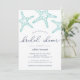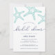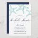 Nossos convites de chá de panela costeiros apresentam estilo náutico clássico com um olhar limpo e minimalista e um toque leve da vida marinha. Design apresenta três ilustrações de estrelas aqua turquesa no topo, com os detalhes do chá de panela embaixo de uma combinação chic de serif azul marinho e sans serif lettering. Perfeito para chás de panela de tema náutico, verão ou praia.