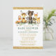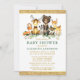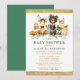 Watercolor Woodland Animal Chá de fraldas Invitation. Os bebês incluem Urso, Veado, Moose, Raccoon, Coelho Coelho, Raposa e Coruja em folhas de eucalipto e verde florestal. Texto Dourado, Brilho Dourado, Fundo Verde.