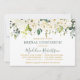 O Cartão de Convite para Chás de panela de Chá de panela Floral Branca com Elegante moderno inclui rosas e flores brancas e vegetação botânica. Script de caligrafia de tendências. Texto Dourado. Sage Green Back.