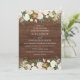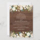 Estes elegantes convites para o casamento apresentam um fundo de madeira marrom, e marfim e flores douradas com folhas verdes.