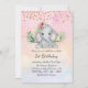Um belo elefante bebê em estilo aquoso com flores delicadas acima da cabeça. O fundo é muito colorido e tem ouro brilho no topo. Um cartão de convite para celebrar o doce primeiro aniversario do seu filho.
