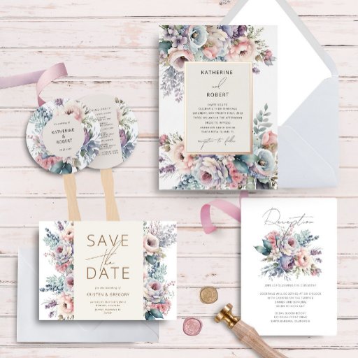 Nossa coleção 'Pastel Garden Wedding' apresenta florais suaves aquarelas em cores pastel, como rosa e azul, com as informações escritas em uma fonte sofisticada sans serif. A folha dos convites vem de ouro, prata e rosa.