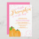 Chamadas de chá de bebê de menina de abóbora com aquarela. Um design de outono com duas abóboras laranja, espirais e uma fonte moderna em cor-de-rosa e cor de laranja de outono.