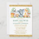 Watercolor Safari Animal Greenery Chá de fraldas. Os bebês incluem elefante, macaco, girafa, rinoceronte, zebra e leão nas folhas de samambaia. Cores d'água, vegetação botânica. Texto Dourado, Largura Dourada. Verdes.