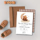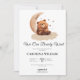 Este convite para chá de fraldas de ursinho d'água apresenta uma cena pacífica com um ursinho dormindo entre nuvens suaves e fofinhas. Em tons suaves de castanho e bege, a design cria uma atmosfera serena e neutra em termos de gênero, perfeita para acolher um novo pequeno. É um convite encantador e caprichoso para um chá de fraldas acolhedor, inspirado na floresta.