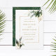 Este convite para o casamento apresenta folhagem tropical verde-aquosa, folhas de monstera, folhas de palmeiras, folhas de bananas e folhas de ouro falsas com sotaque tropical no verso. É perfeito para um casamento tropical, de verão, de praia ou de destino. >>> Veja a coleção inteira >> https://www.zazzle.com/collections/tropical_foliage_gold_collection-119316977990783186