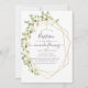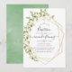 A moda verde e branca da água deixa convite batismo com moldura geométrica dourada e tipografia elegante de escrita manual.