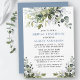 O Cartão de Convite para Chás de panela de Lunco de Cor Biológica Elegante Moderna inclui folhas de eucalipto, folhagem botânica verde, folhas azuis empoeiradas e outros belos lençóis botânicos. Pó Azul.