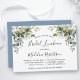 O Cartão de Convite para Chás de panela de Lunco de Cor Biológica Elegante Moderna inclui folhas de eucalipto, folhagem botânica verde, folhas azuis empoeiradas e outros belos lençóis botânicos. Script de Caligrafia. Pó Azul.