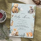 Convites para bebês de inverno bonito com ilustrações de aquarelas de bebês na neve. Um pouco de raposa, urso, filhote de lobo, fada e coelhinha enquadra seus detalhes do evento. Cor azul do Pastel.