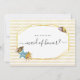 Conchas de aquarela e estilo cursivo de escrita caligrafia escrita à mão casamento de praia verão "Você será minha madrinha de casamento?". Mostra um quadro de polígono de folha de ouro com conchas, texto e listras.