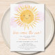 Convide a família e os amigos para o chá de fraldas de sua garota com tema solar com este bonito convite ao chá de fraldas. Ele apresenta o texto "Aqui Vem O Sol" na tipografia na moda com uma cor amarela e um sol cor-de-água fofinho. O dorso é decorado com um padrão de sol sorridente. Facilmente personalizável. Original Watercolor © Michele Davies.