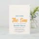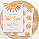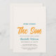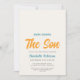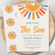 Convide a família e os amigos para o seu chá de fraldas temático com este belo convite para o chá de fraldas dos rapazes. Apresenta o texto "Aqui Vem o Filho" na tipografia da na moda com um sol de cor aquosa brilhante sobre fundo creme macio. As costas estão decoradas com um padrão solar. Facilmente personalizável. Original Watercolor © Michele Davies.