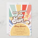 Retro Chá de fraldas Invitation com fundo de explosão solar, flores de margarida dispersas e as palavras "aqui vem o sol" em uma fonte de ranhura 70. Sacudir nosso doce convite para ver uma coordenação de volta.