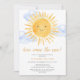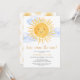 Convide a família e os amigos para o chá de fraldas do seu rapaz com temática solar com este belo convite para chás de fraldas. Ele apresenta o texto "Aqui Vem O Sol" na tipografia na moda com uma aquarela amarela e nuvens azuis. O dorso é decorado com um padrão de sol sorridente. Facilmente personalizável. Original Watercolor © Michele Davies.