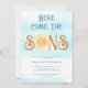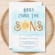 Convide a família e amigos para o chá de fraldas dos seus gêmeos com o tema do sol com este belo convite à luz do sol. Ele apresenta o texto "Aqui Vem os Filhos" em tipografia retrorreflectora azul com um sol de aquarela aguda em um fundo azul-céu. Facilmente personalizável. Original Watercolor © Michele Davies.