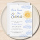 Convide a família e amigos para o chá de fraldas dos seus gêmeos com tema solar com este convite fofo. Apresenta o texto "Aqui Vem os Filhos" na tipografia azul na moda com uma aquarela amarela e nuvens. Facilmente personalizável. Original Watercolor © Michele Davies.