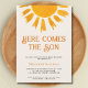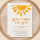 Convide a família e os amigos para o seu chá de fraldas temático com este belo convite para o chá de fraldas dos rapazes. Apresenta o texto "Aqui Vem o Filho" em retrorreflectotipografia com um sol de aquarela amarelo sobre fundo de creme macio. Facilmente personalizável. Original Watercolor © Michele Davies.