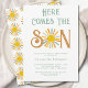 Convide a família e amigos para o chá de fraldas dos seus bebês com este convite para chás de fraldas temático do sol. Apresenta o texto "Aqui Vem o Filho" em tipografia retrorreflectora verde com uma aquarela amarela. As costas estão decoradas com um padrão solar. Facilmente personalizável. Original Watercolor © Michele Davies.