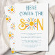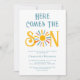 Convide a família e amigos para o chá de fraldas dos seus bebês com este convite para chás de fraldas temático do sol. Apresenta o texto "Aqui Vem o Filho" em tipografia retrô azul com uma clara cor d'água. As costas estão decoradas com um padrão solar. Facilmente personalizável. Original Watercolor © Michele Davies.