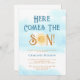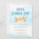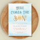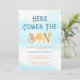Convide a família e os amigos para o seu chá de fraldas temático com este belo convite para o chá de fraldas dos rapazes. Apresenta o texto "Aqui Vem o Filho" em retrorreflectotipografia com uma cor amarela e um fundo azul-claro-sol. Facilmente personalizável. Use a Ferramenta Design para alterar o tamanho, o estilo ou a cor do texto. Original Watercolor © Michele Davies.