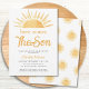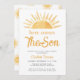 Convide a família e os amigos para o chá de fraldas do seu rapaz temático com este divertido convite. Apresenta o texto "Aqui Vem o Filho" na tipografia da na moda com um sol amarelo de aquarela. Facilmente personalizável. As costas estão decoradas com um padrão solar. Original Watercolor © Michele Davies.