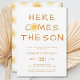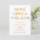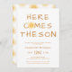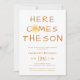 Convide a família e os amigos para o seu chá de fraldas temático com este belo convite para o chá de fraldas dos rapazes. Ele apresenta o texto "Aqui Vem O Filho" e um lindo sol sorridente de aquarela amarela. As costas estão decoradas com um padrão solar. Facilmente personalizável. Original Watercolor © Michele Davies.