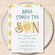 Convide a família e amigos para o chá de fraldas dos seus rapazes com o tema do sol com este belo convite à luz do sol. Ele apresenta o texto "Aqui Vem o Filho" em tipografia azul na moda com um lindo sol de aquarela sorridente. O dorso é decorado com um padrão solar amarelo. Facilmente personalizável. Original Watercolor © Michele Davies.