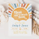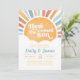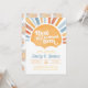 Este adorável convite para o chá de fraldas do filho retro Groovy Sunshine apresenta um lindo sol de aquarela, aliado a fontes retrorreflectoras, nuvens brancas e ondas do sol. Também está incluído um belo lado de trás do sol! Este Chá de fraldas de Evite e Convite para Chás de fraldas está certo de concluir qualquer chá de fraldas de sol, aspersão para bebês, brunch para bebês ou revelação de gênero! Ao usar o software Zazzle fácil de usar (sem download necessário) no seu navegador, você simplesmente compra e personaliza tudo no mesmo lugar. É tão fácil assim!