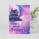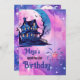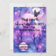 Pink Halloween Spider assusta mansão 4.º aniversário Convite - Bem-vindos a esta maldita festa de aniversário. Não, a aranha não morde, é a aranha mais amistosa da cidade em tons roxos e cor-de-rosa com uma mansão assustadora e morcegos voando na frente, esta design também apresenta um templo igualmente santificado nas costas com um morcego e maravilhosas luas rosa. Personalize o cartão de aniversário de outubro do seu filho ou use-o para uma festa do Dia das Bruxas.
