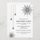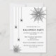 Design de convite do partido Halloween, preto e branco minimalista, com silhuetas simples de aranha preta penduradas em alguma teia de aranha. Há também duas teias em cantos opostos e algumas poucas áreas de texto personalizáveis ideais para escrevendo os detalhes do evento. As cores deste design podem ser mudadas para qualquer outra cor, se desejado.