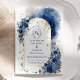 Um design de casamento luxuoso com tema celeste, com um jardim floral azul de meia-noite, sotaque de ouro, e uma lua crescente de ouro enquadrada por um arco de ornamentado. Perfeito para casais que buscam uma celebração romântica, mística e inspirada na noite estelar com detalhes cósmicos elegantes.