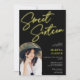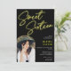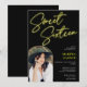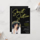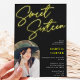 Um brilhante e ousado Sinal de Neon amarelo, com um convite de aniversário de 16 fotos em preto.
