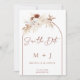 Arch Floral White Brown Boho Salve o Cartão de Datas Um minimalista moderno salve nosso cartão de data apresentando um arco e arranjo floral em tons castanhos, brancos e naturais. Este design também apresenta as iniciais dos casais, o cabeçalho da imagem da caligrafia moderna e uma foto do casal no verso.