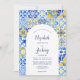 Este design rústico apresenta um padrão de fundo de azulejos portugueses, azulejos, de cor aquática azul, amarela e branca. Personalize-o com os nomes da noiva e do noivo em um roteiro de caligrafia azul e o texto remanescente em uma combinação de sans serif, copperplate e itálico em forma de arco branco. Um padrão de azulejo correspondente aparece no lado oposto.
