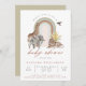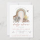 Um convite ao chá de fraldas moderno, neutro em termos de gênero, que inclui animais de safari selvagens - girafa, elefante, leão e ave com arco-íris de arco terrestre. "chá de fraldas" está na cinza da caligrafia moderna. Personalize com seus detalhes. O reverso está em cinzas sólidas. Um design neutro de excelente para uma menina ou um bebê.
