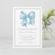 Um tema charmoso de chá de fraldas com um adorável arco azul-d-água. A frente inclui linhas de caligrafia de script manuscritas em uma cor azul suave para corresponder ao arco, em conjunto com um quadro de cinza fino duplo para um toque elegante e tradicional. A parte traseira apresenta uma cor azul clara que complementa o arco na parte frontal. Esse simples e mínimo design oferece um visual clássico de chá de fraldas, com texto de cinza numa mistura de serifa e tipografia de scripts de caligrafia. Celebrar a futura mãe no estilo! Você pode personalizar as cores da fonte e do plano de fundo para se adequar ao seu tema. Perfeito para chás de fraldas do ano inteiro, mas especialmente encantador para uma festa de jardim ou brunch. A decoração é fácil com fitas azuis e arcos, ou você pode incorporar outros temas também. Disponível como convite impresso ou como convite digital para download que pode ser enviado por e-mail ou impresso localmente!