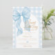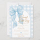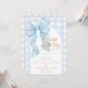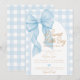 Elegante e doce, este convite de chá de bebê para menino apresenta um grande e lindo laço azul como peça central com uma escrita refinada que anuncia "Um Doce Menininho Está a Caminho". Perfeito para um chá de bebê clássico, elegante ou temático de laço para menino, este convite é uma escolha sofisticada e encantadora que celebra a chegada de um doce menino com estilo.