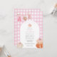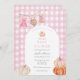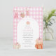 Convite para chá de fraldas com uma estrutura arquivada com abóboras e arco cor-de-rosa com um fundo de padrão de gingham rosa. Personalize com suas informações para que a mãe esteja. Clique em "clicar para personalizar mais" para alterar o estilo, o tamanho ou a cor da fonte.