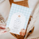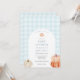 Convite para chá de fraldas com uma estrutura arquivada com abóboras e um padrão de gingham azul. Personalize com suas informações para que a mãe esteja. Clique em "clicar para personalizar mais" para alterar o estilo, o tamanho ou a cor da fonte.