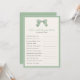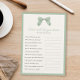 Perguntas editáveis sobre o título do jogo e texto para o chá de fraldas ou chá de panela. Como você sabe que a mãe é, quem sabe o melhor jogo de mamães. Apresenta um arco pintado manualmente com uma xadrez sutil no fundo de Sage Green e marfim; borda e cor de fundo editáveis na frente e atrás.