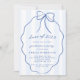 Um convite de festa de formatura caprichosa com uma moldura oval ondulada desenhada pela mão tocada com um arco, sobre um fundo de listras azuis-claras. O título editável "class of 2025" está em uma fonte de estilo manuscrito azul. Adicione a foto do formando no verso.