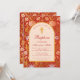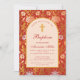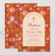 Um convite de batismo floral que combina elementos vintage e modernos. Em um padrão floral de rosas e lírios brancos em fundo vermelho - um padrão Morris vintage por John Henry Dearle (1860–1932), "Rosa e Lírio", de 1893, agora em domínio público - há um arco branco com texto vermelho dentro dele. A palavra Batismo e os nomes são escritos em um roteiro caligráfico elegante, a primeira linha é texto arqueado, sobre uma cruz amarela dourada.