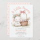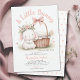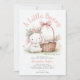 Uma ilustração encantadora de aquarela com um coelho precioso vestindo uma coroa estilizada de flores silvestres e sentada ao lado de uma cesta de piquenique, adoçadamente decorada com um arco rosa, aprecia este delicado convite de chá de menina que é um ajustado perfeito para uma celebração da primavera, eventos de Páscoa, um fête de jardim de verão ou um encantador chá de fraldas de piquenação.