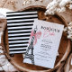 Este elegante convite de chá de fraldas inspirado em Paris apresenta um design preto e branco chic com uma Torre Eiffel desenhada à mão com um arco de aquarela cor rosa suave. A sofisticada tipografia combina fontes clássicas de serif e na moda manuscritas, com "Bonjour Bébé" numa delicada mistura de preto e rosa esbranquiçado, acrescentando um toque de charme francês. O verso do convite mostra um padrão ousado de faixas horizontais, preto e branco, criando um contraste em voga. Perfeito para um chá de fraldas de temática parisiense, este design exude elegância eterno, romance e sofisticação moderna, fazer-o como a escolha ideal para celebrar a chegada de um pequeno ao estilo.
