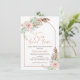 Convite de chuveiro de casais taco 'bout love com caligrafia moderna em rose gold falso em estilo boêmio, apresentando um arranjo de cacto florido rosa, grama pampas e um arco de rose gold falso.